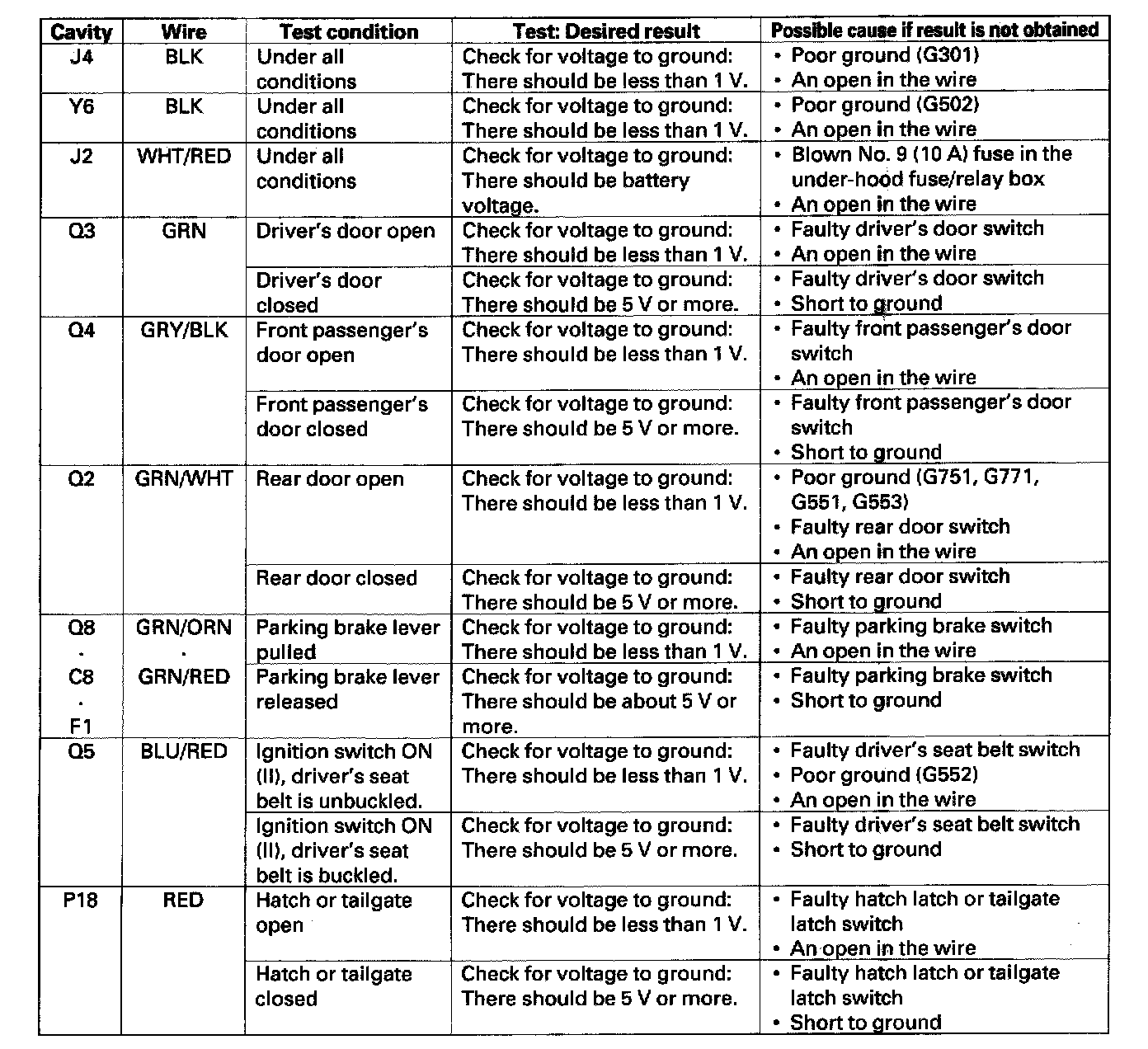 4. Reconnect the connectors to the under-dash fuse/relay box, and make these input tests at the appropriate connectors on the under-dash fuse/relay box.