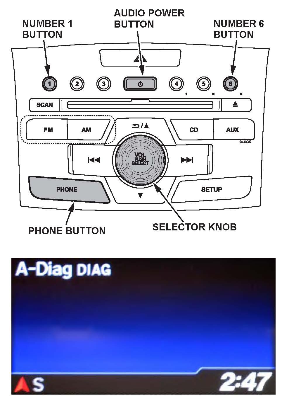 4. Press and hold the PHONE button for at least 5 seconds to enter the HFL diagnostic mode. One of the following screens appears: "A-Diag XXXXX OK" or "A-Diag---."