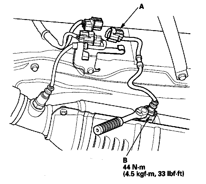 1. Disconnect the secondary HO2S 4P connector (A), then remove the secondary HO2S (B).