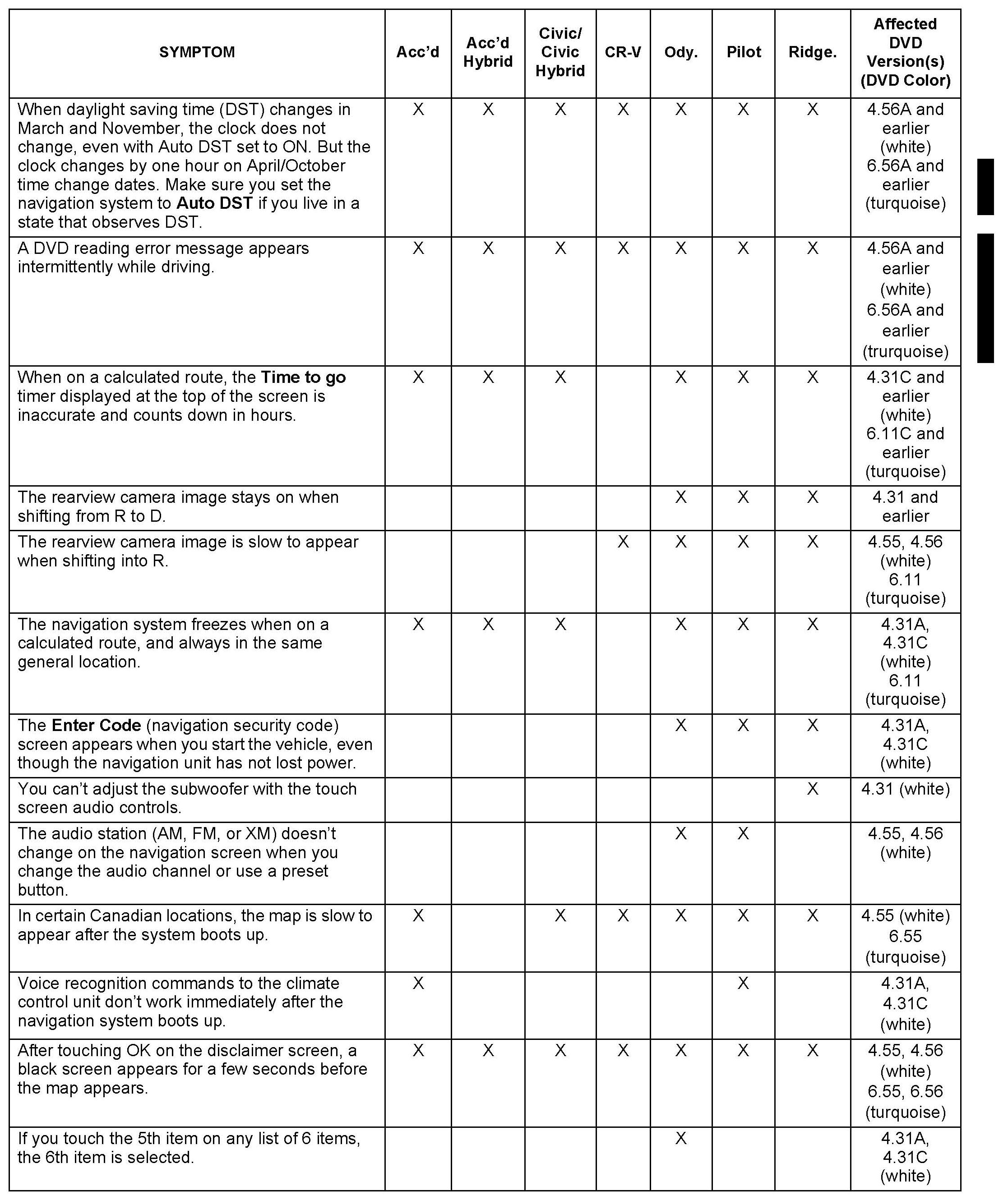 Navigation Software Updates for Daylight Saving Time (DST), DVD Read Error Message, and Other Listed Symptoms (see Table)