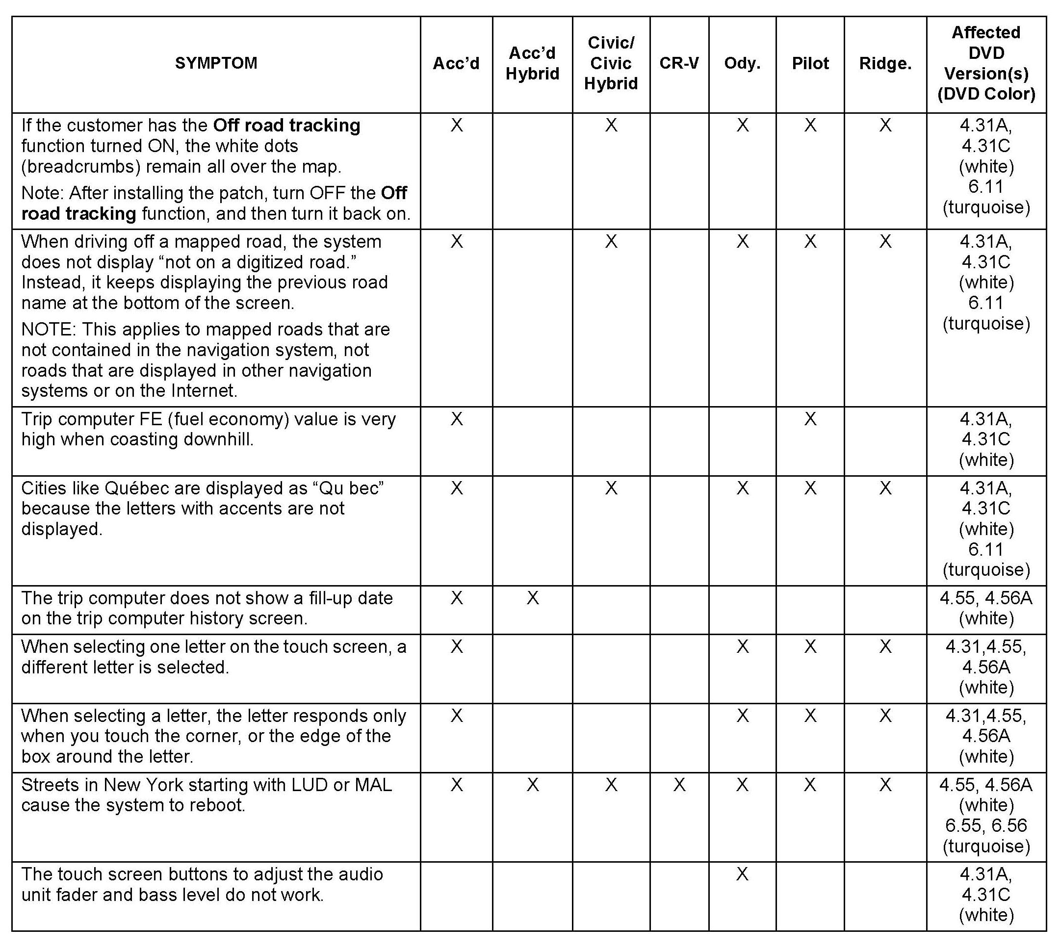 ^ If the customer complaint is not in the list, this bulletin may not apply. Troubleshoot the navigation system using normal troubleshooting procedures, and check the iN for more information.