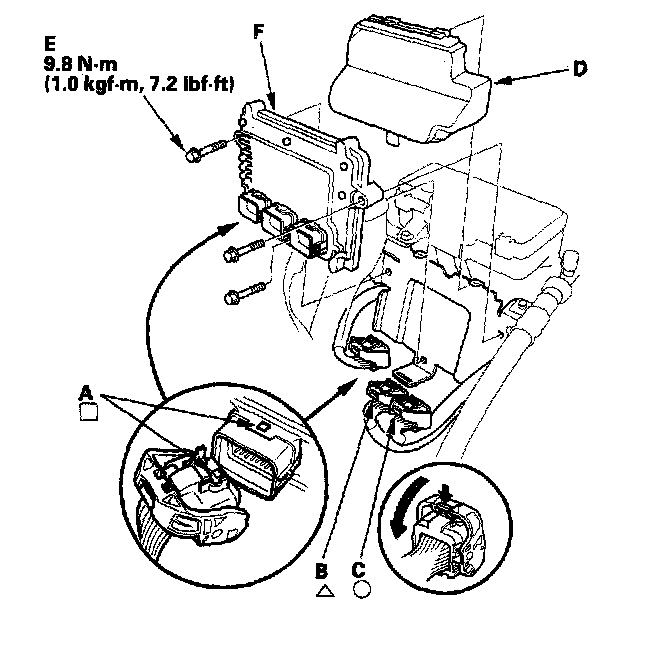 10. Remove the bolts (E), then remove the PCM (F).