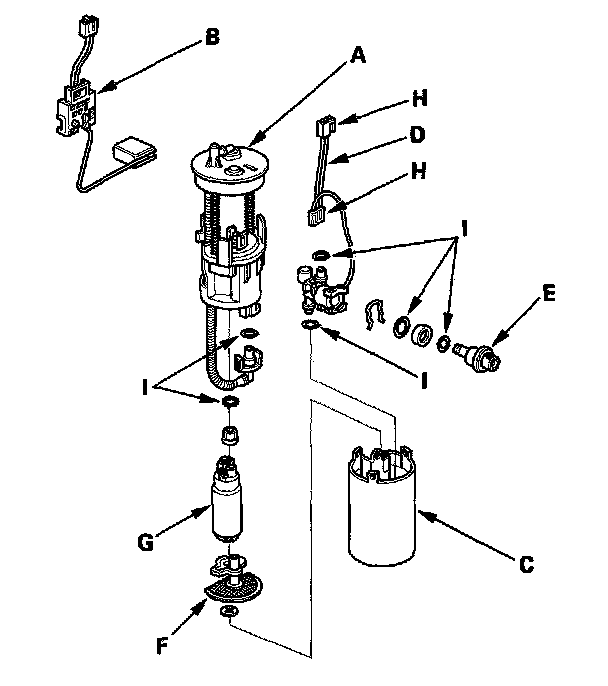 3. When connecting the fuel pump assembly, make sure the connection is secure and the suction filter (F) is firmly connected to the fuel pump (G).