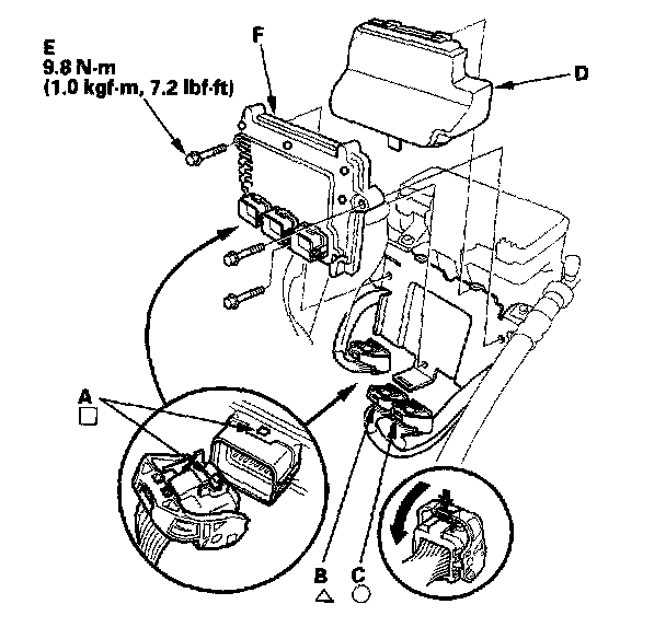 11. Remove the bolts (E), then remove the PCM (F).