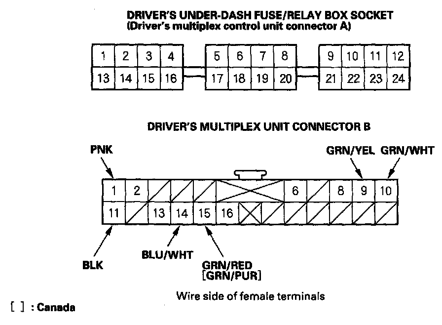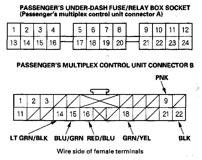 4. With the passenger's multiplex control unit still disconnected, make these input tests at the connector and passenger's underdash fuse/relay box sockets.