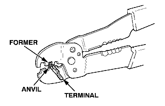 4. Position the terminal in the crimping tool slot with the solid portion of the terminal toward the anvil and the open section toward the former.