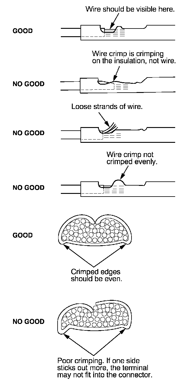 8. Inspect the quality of the wire crimp. If it has any of the shown NO GOOD crimps, cut it off and start over.