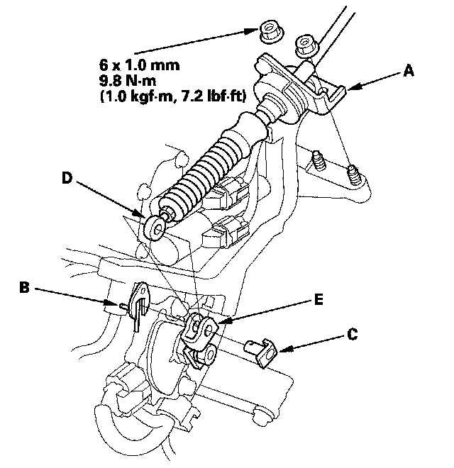7. Remove the spring clip/washer (B) and control pin (C), then separate the shift cable end (D) from the control lever (E).