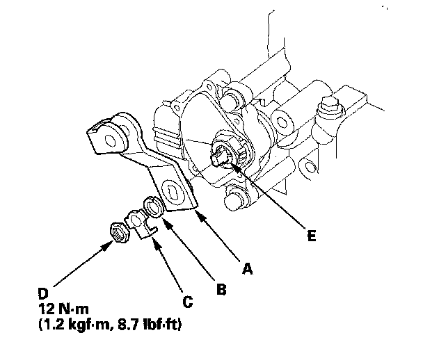 15. Install the new lock washer (A) over the selector control shaft (B) while aligning the projection (C) of the lock washer with the N positioning line (D) on the transmission range switch (E), and install the locknut (F).