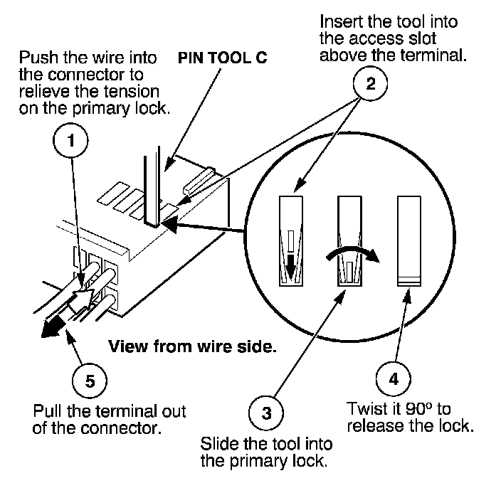Before you begin, inspect the wire you are about to repair for damage and length. Make sure the wire will be long enough to make a terminal repair without stretching it when you reinstall the terminal in the connector. If the wire is too short, or if access to the connector is too restricted to make a terminal repair, you may need to install a pigtail terminal (a short length of wire with a factory-crimped terminal on it).