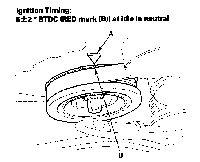 8. Aim the light toward the pointer (A). Check the ignition timing under a no load condition (headlights, blower fan, and air conditioner are turned off).