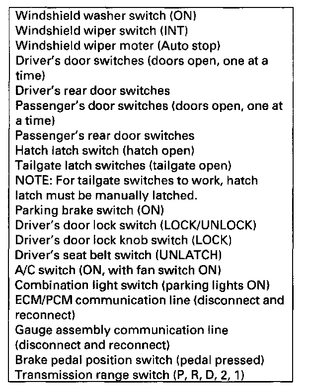 9. Look in the following table for the switches most closely related to the problem. While still in Mode 2, operate the switches. If the circuit is OK, the ceiling light should blink once. If the circuit is faulty, there will be no indication. In the table is a list of circuits that can be checked in Mode 2.