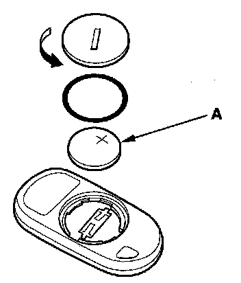 3. Replace the transmitter battery (A) with a new one, and try to lock and unlock the doors with the transmitter by pressing the lock or unlock button five or six times.