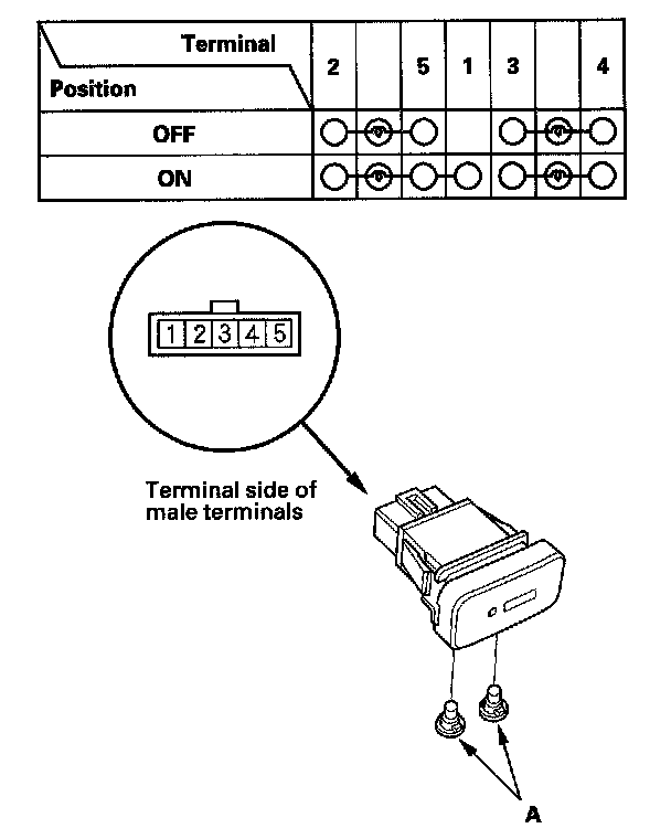 2. Check for continuity between the terminals in each switch position according to the table. If there is no continuity, replace illumination bulbs (A) or the switch.