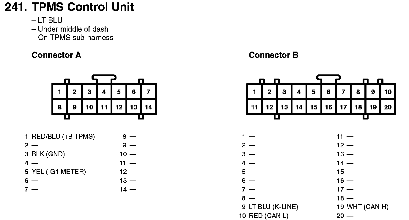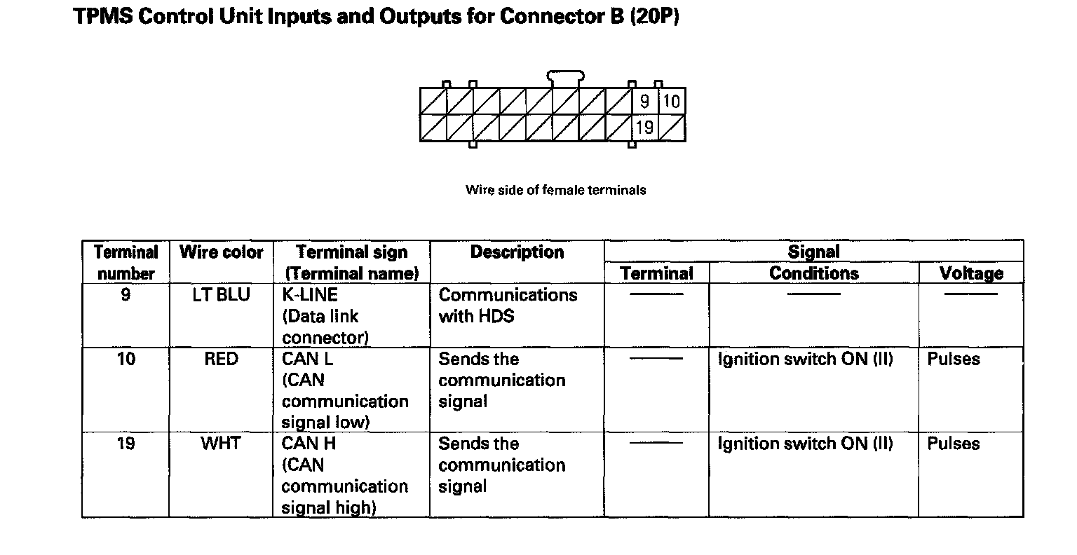 TPMS Control Unit Inputs and Outputs for Connector B (20P):