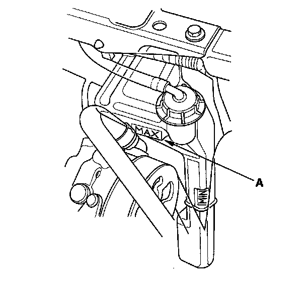 6. Fill the reserve tank to the MAX mark (A) with Honda Long Life Anti-freeze/Coolant Type 2 (P/N 0L999-9001).