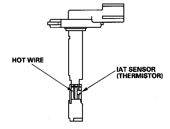 The mass air flow (MAF) sensor/intake air temperature (IAT) sensor contains a hot wire and a thermistor. It is located in the intake air passage. The resistance of the hot wire and thermistor change due to intake air temperature and air flow. The control circuit in the MAF sensor controls the current to keep the hot wire at a set temperature. The current is converted to voltage in the control circuit, then output to the ECM/PCM.