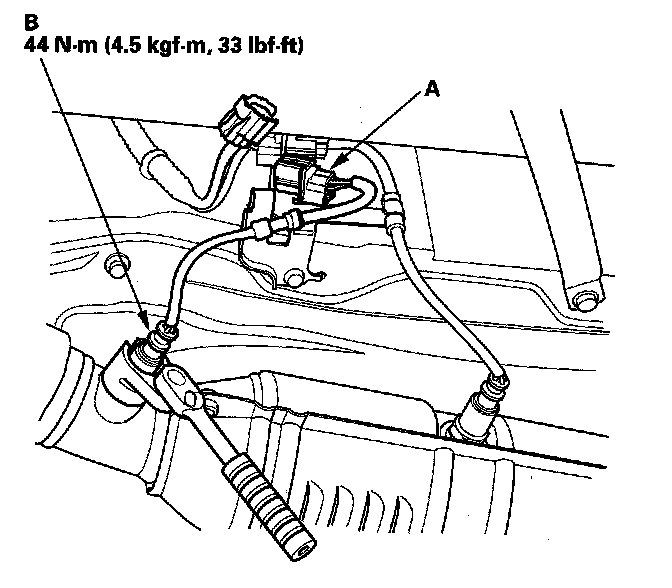 1. Disconnect the A/F sensor 4P connector (A), then remove the A/F sensor (B).