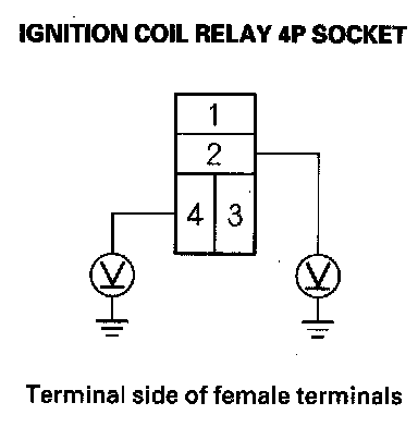 3. Measure the voltage between ignition coil relay 4P socket terminal No. 2 and body ground, then terminal No. 4 and body ground.