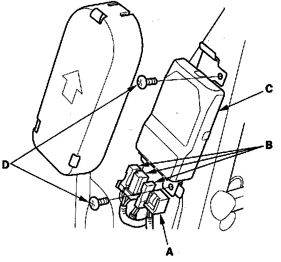 1. Place the new ODS unit (A) on the seat-back frame. Tighten the two bolts (B), and connect the ODS unit harness 18P connector (C) and sensor connectors (D) to the ODS unit.