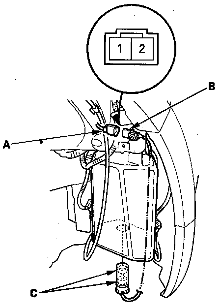 2. Disconnect the 2P connector (A) from the washer fluid level switch (B).