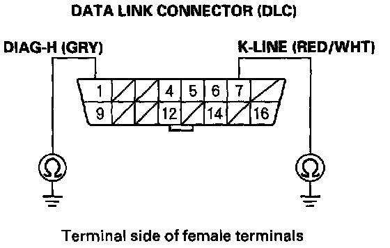 16. Check for continuity between body ground and DLC terminals No. 1 and No. 7 individually.