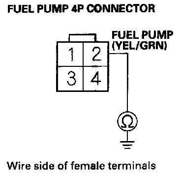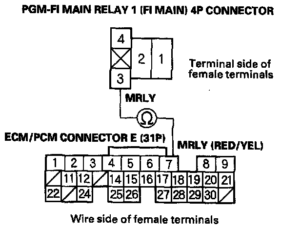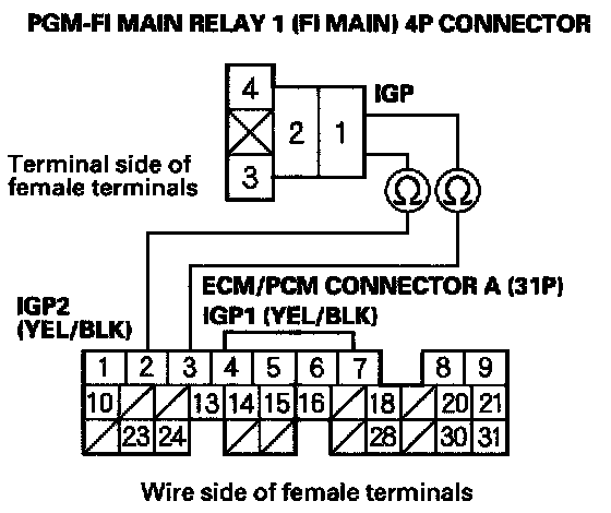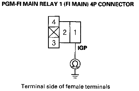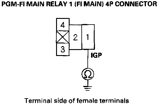 41. Check for continuity between body ground and PGM-FI main relay 1 (FI MAIN) 4P connector terminals No. 2 and No. 4 individually.