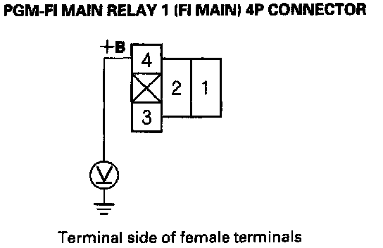 65. Measure voltage between PGM-FI main relay 1 (FI MAIN) 4P connector terminal No. 4 and body ground.