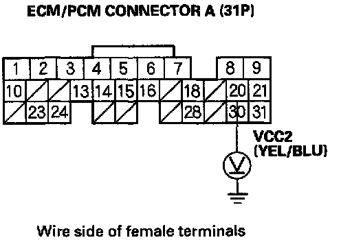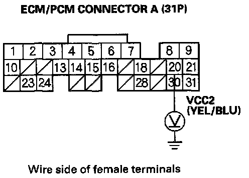 83. Disconnect the connector from each of these sensors, one at a time, while measuring voltage between body ground and ECM/PCM connector terminal A20 with the ignition switch ON (II)