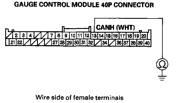 13. Check for continuity between gauge control module 40P connector terminal No. 12 and body ground.