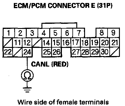 23. Check for continuity between ECM/PCM connector terminal E24 and body ground.