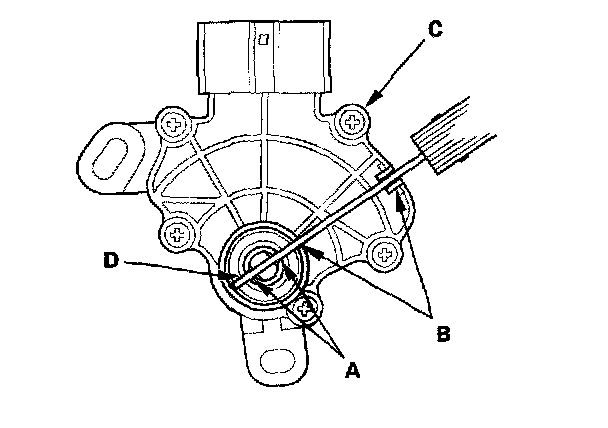 6. Align the cutouts (A) on the rotary-frame with the neutral positioning cutouts (B) on the transmission range switch (C), then put a 2.0 mm (0.08 in.) feeler gauge blade (D) in the cutouts to hold the switch in the N position.