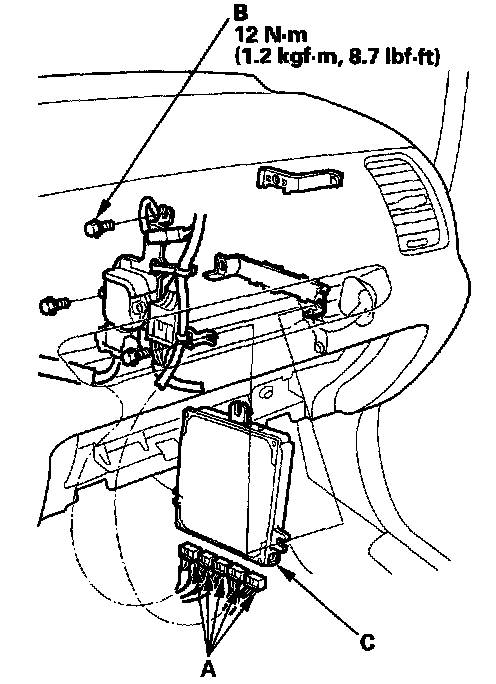 8. Disconnect the connectors (A), and remove the bolts (B), then remove the ECM/PCM (C).