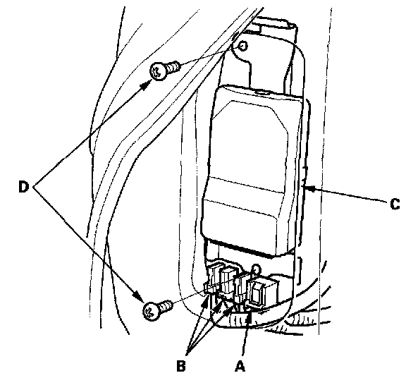 1. Place the new ODS unit (A) on the seat-back frame. Tighten the two bolts (B), and connect the ODS unit harness 18P connector (C) and sensor connectors (D) to the ODS unit.
