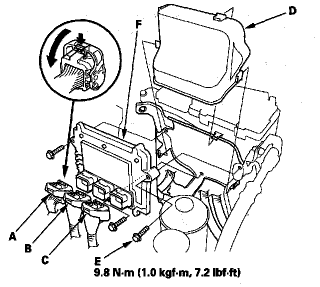 8. Remove the bolts (E), then remove the PCM (F).