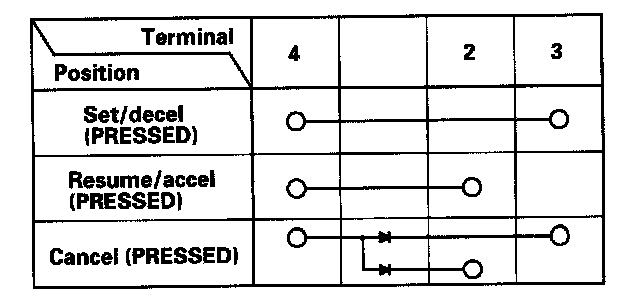- If there is continuity, and it matches the table, but switch failure occurred on the cruise control input test, check and repair the wire harness on the switch circuit.