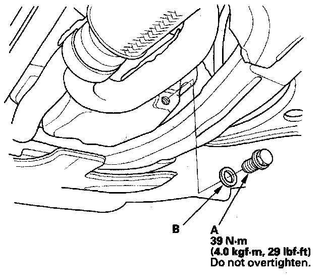 3. Reinstall the drain bolt with a new washer (B).