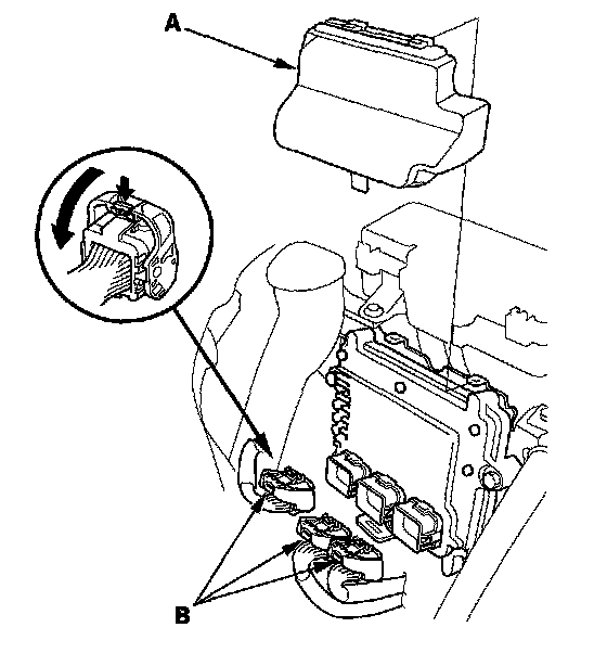 2. Remove the cover (A) from the PCM, disconnect the PCM connectors (B) and probe the terminals from the terminal side of the connectors.
