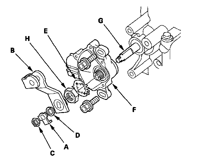 10. Pry the lock tabs of the lock washer (E) on the transmission range switch (F), hold the selector control shaft (G) with a 6.0 mm wrench, and loosen the locknut (H).