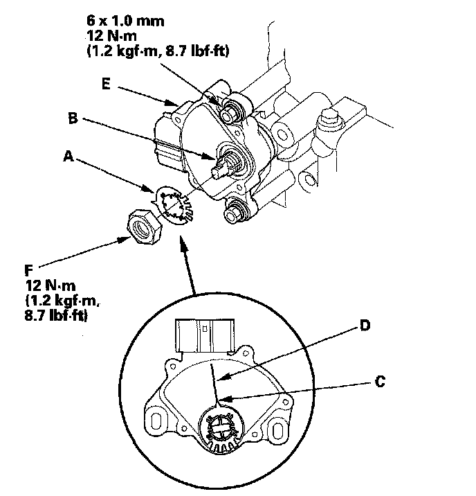 15. Install the new lock washer (A) over the selector control shaft (B) while aligning the projection (C) of the lock washer with the N positioning line (D) on the transmission range switch (E), and install the locknut (F).