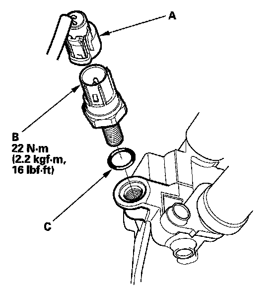 Rocker Arm Oil Pressure Switch (VTEC Oil Pressure Switch) Replacement1. Disconnect the rocker arm oil pressure switch (VTEC oil pressure switch) connector (A), then remove the rocker arm oil pressure switch (VTEC oil pressure switch) (B).
