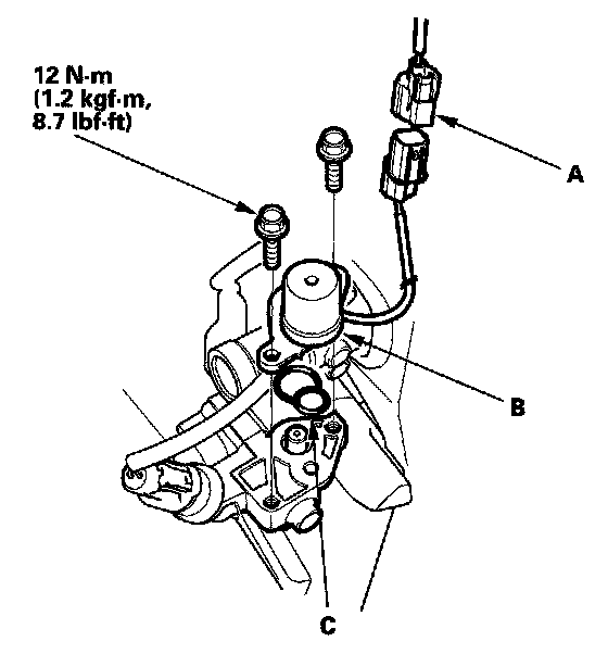 Rocker Arm Oil Control Solenoid (VTEC Solenoid Valve) Replacement1. Disconnect the rocker arm oil control solenoid (VTEC solenoid valve) connector (A).