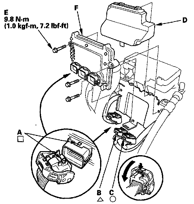 NOTE: The PCM connectors A, B, and C have symbols (A=[], B=/\, C=O) embossed on them for identification.