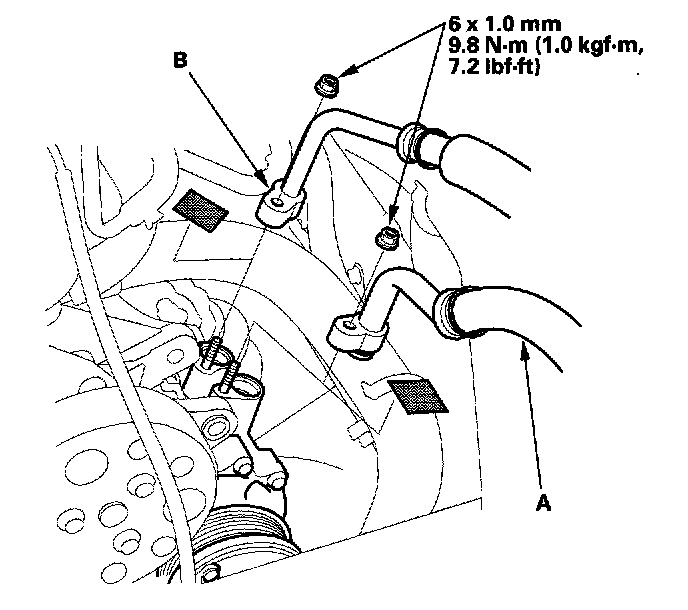 7. Remove the nuts, then disconnect the suction line (A) and the discharge line (B) from the A/C compressor. Plug or cap the lines immediately after disconnecting them to avoid moisture and dust contamination.