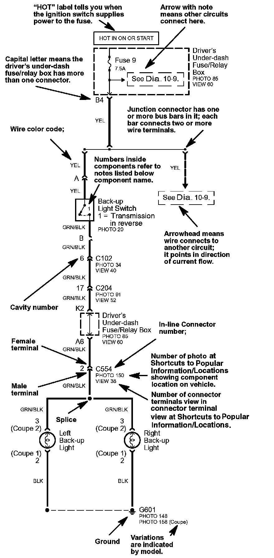 Most connector numbers and component names are PHOTO and VIEW numbers. The PHOTO number refers to a photo at shortcuts to Popular Information/Locations that shows the connector's location on the car. The VIEW number refers to an connector view at shortcuts to Popular Information/Locations that shows the connector terminals, wire colors, connector cavity numbers, and other details.