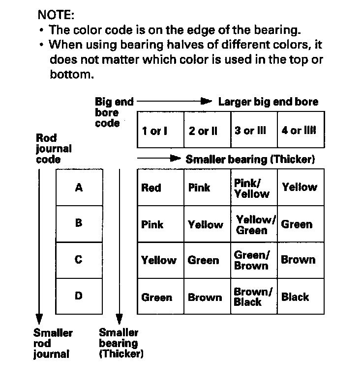 Each connecting rod has a tolerance range from 0 to 0.024 mm (0.0009 in.), in 0.006 mm (0.0002 in.) increments, depending on the size of its big end bore. It's then stamped with a number or bar (1, 2, 3, or 4/I, II, III, or IIII) indicating the range.
