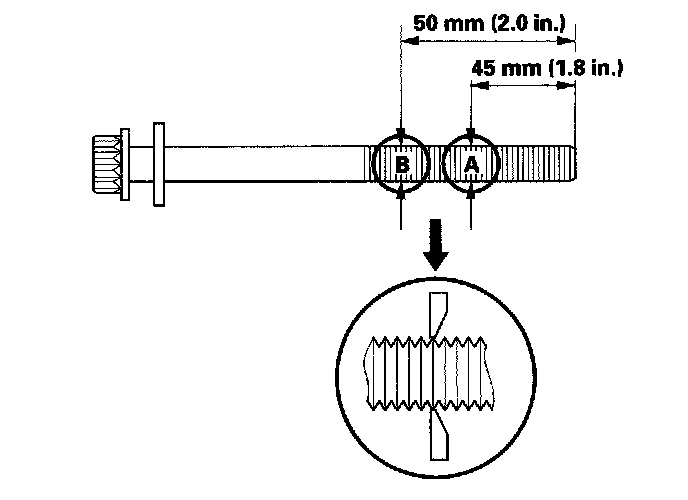 If either diameter is less than 10.6 mm (0.42 in.), replace the cylinder head bolt.