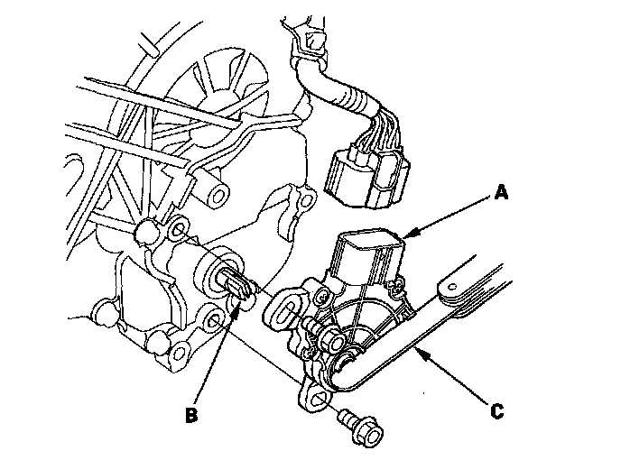 6. Align the cutouts (A) on the rotary-frame with the neutral positioning cutouts (B) on the transmission range switch (C), then put a 2.0 mm (0.08 in.) feeler gauge blade (D) in the cutouts to hold the switch in the N position.