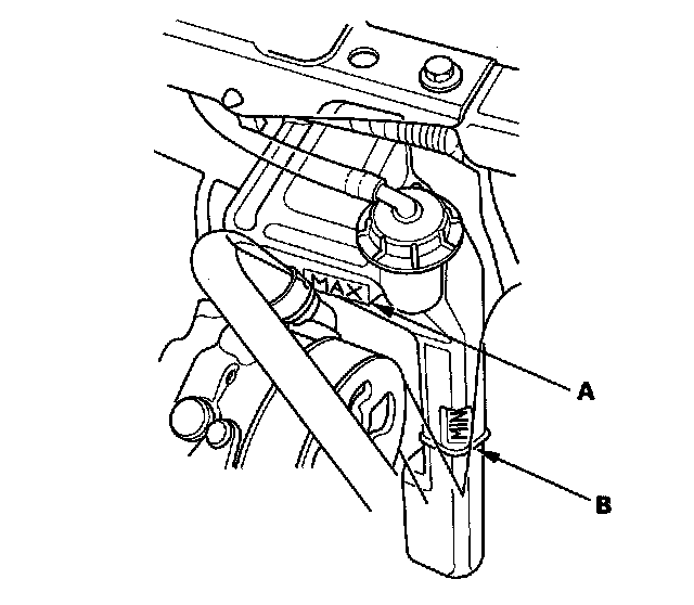 Coolant Check1. Look at the coolant level in the coolant reservoir. Make sure it is between the MAX mark (A) and MIN mark (B).