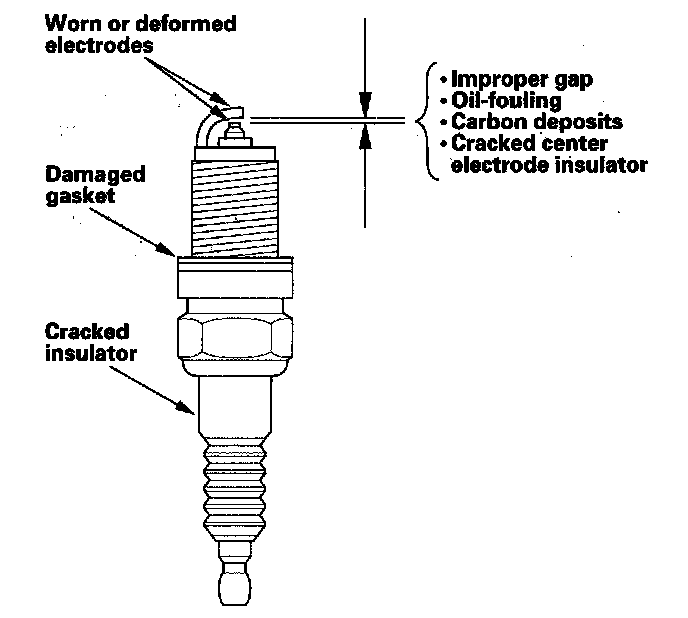 Spark Plug Inspection1. Remove the spark plugs, and inspect the electrodes and the ceramic insulator.
